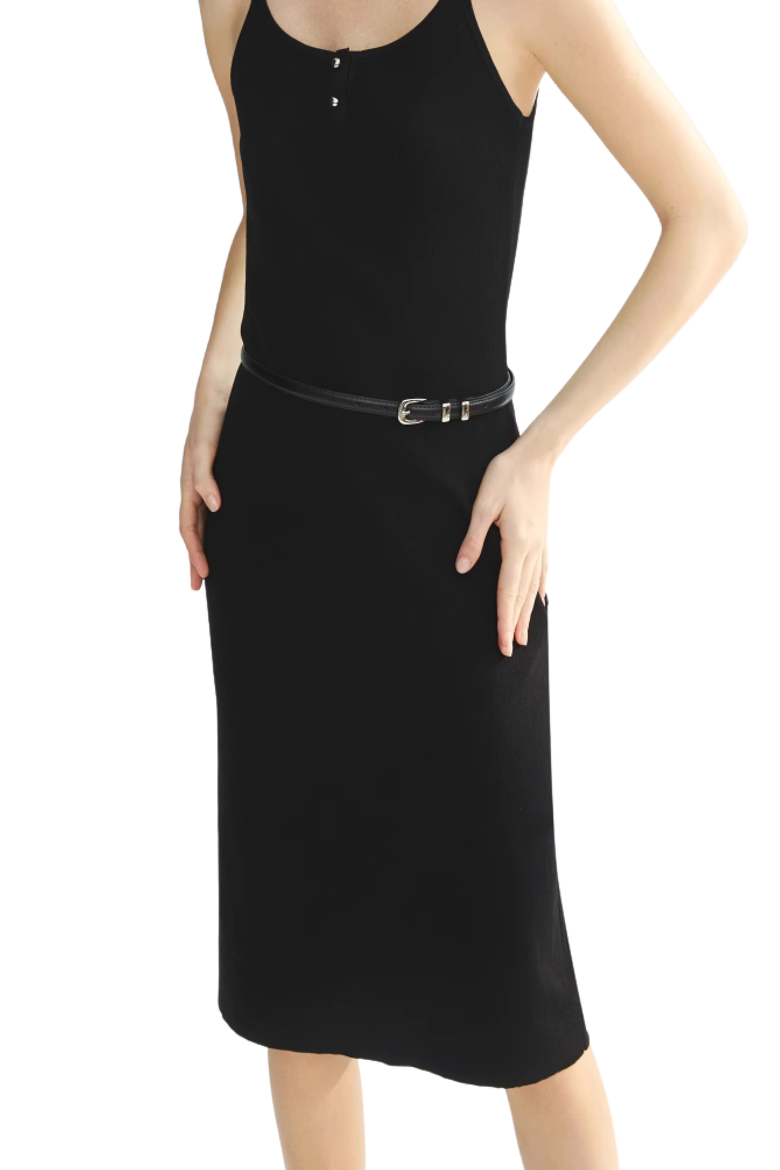 This black dress features a minimalist strappy design, accentuated by delicate front buttons that add a subtle yet fashionable touch. The fitted silhouette flatters the figure, while the comfortable, stretchy fabric ensures all-day wearability. Whether paired with heels for an evening look or dressed down with flats or sneakers for everyday outings, this versatile piece seamlessly adapts to a variety of occasions, making it a must-have staple in your wardrobe.