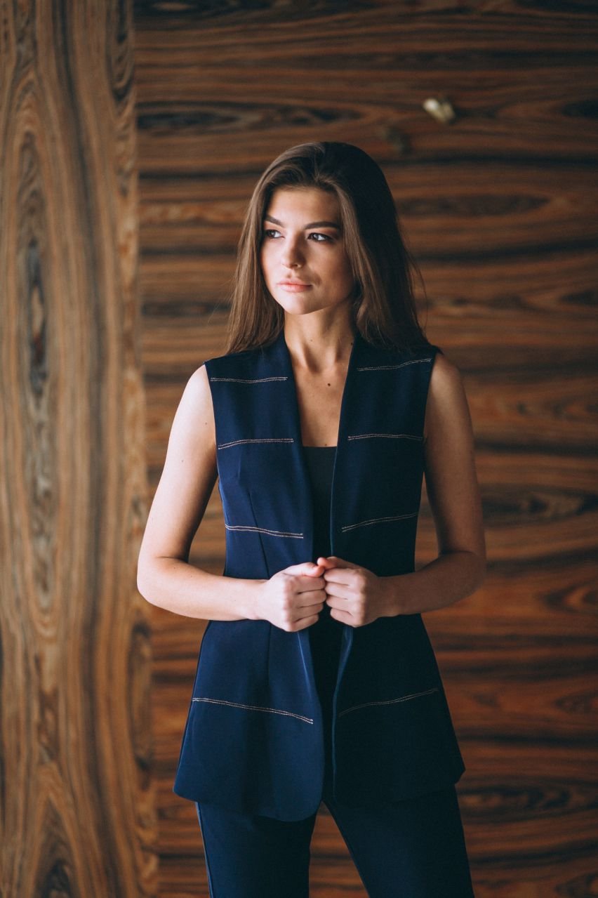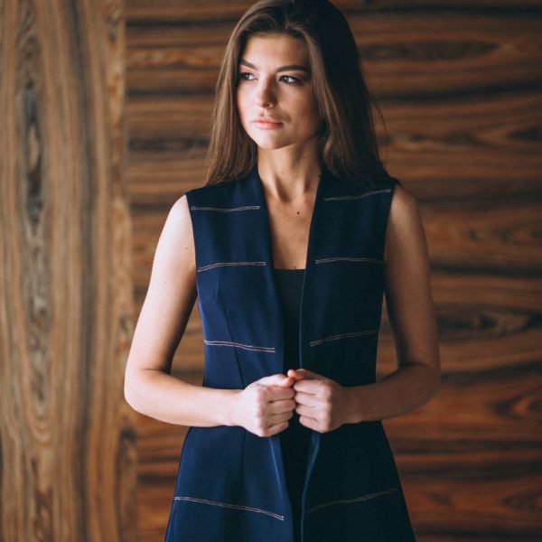 Add a touch of polished sophistication to your wardrobe with this sleeveless navy vest featuring subtle horizontal stripes. Crafted from a lightweight, structured fabric, it offers a flattering, elongated silhouette that effortlessly complements both casual and formal outfits. The open-front design allows for easy layering over tops or blouses, making it a versatile piece suitable for the office, weekend outings, or evening events. Whether paired with matching trousers, jeans, or a skirt, this vest provides an instant style upgrade to any ensemble.