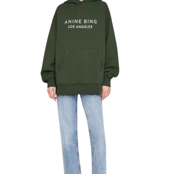 Elevate your casual wardrobe with this forest green oversized hoodie, showcasing a bold “ANINE BING LOS ANGELES” graphic across the chest. Crafted from a soft, mid-weight cotton-blend, it features a relaxed silhouette and dropped shoulders for a comfortable, laid-back vibe. The roomy hood and classic kangaroo pocket offer practicality and warmth, while the ribbed cuffs and hem ensure a snug fit. Pair it with jeans, leggings, or shorts for a versatile streetwear look that transitions effortlessly from errands to social outings.