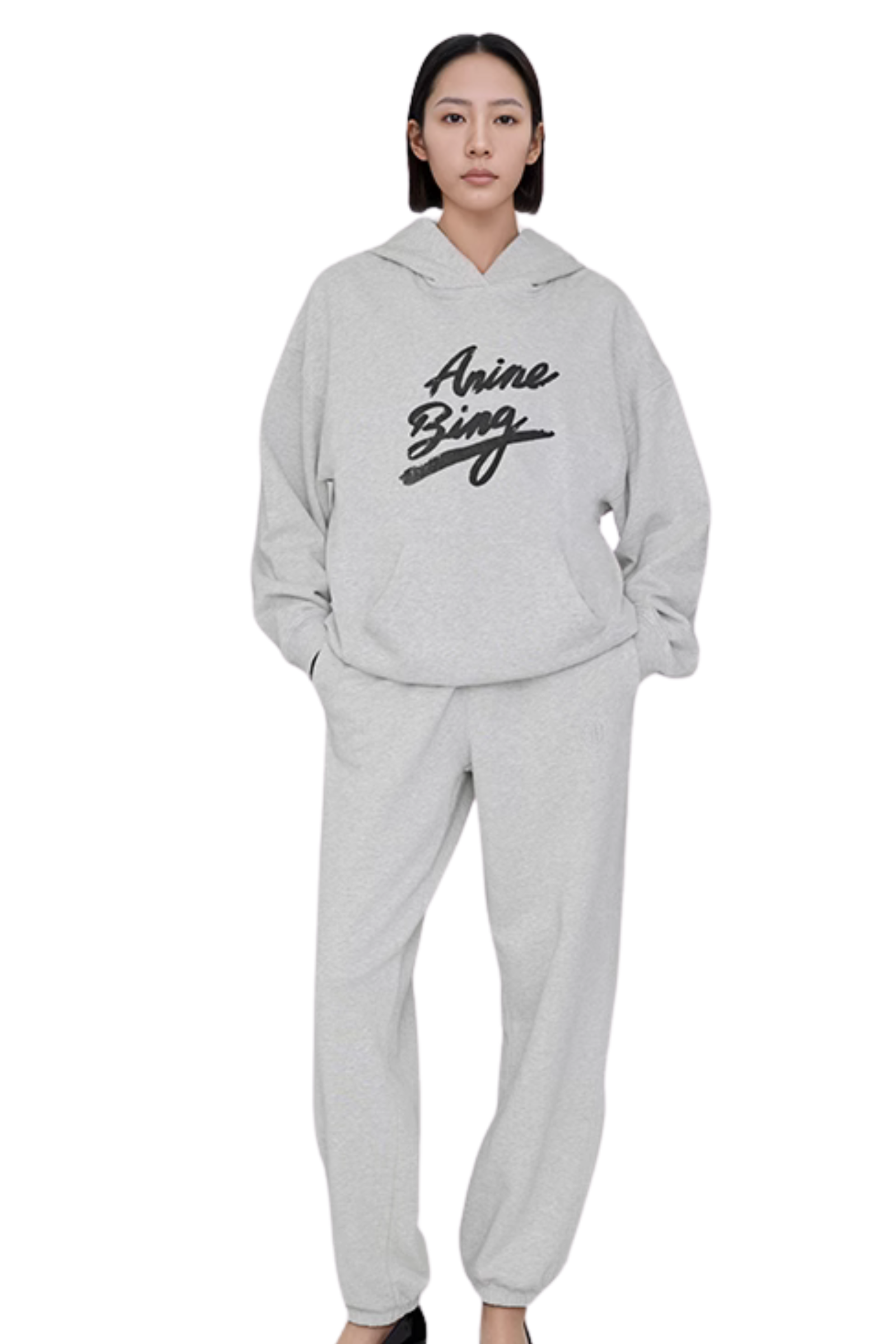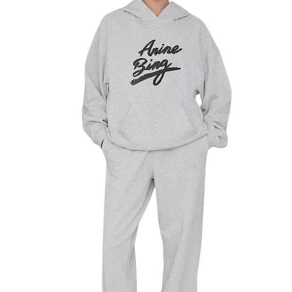 Upgrade your off-duty wardrobe with this coordinated heather gray hoodie and joggers set, featuring a bold “Anine Bing” print on the front. Crafted from a soft, mid-weight cotton-blend, both pieces offer a relaxed fit for everyday comfort. The hoodie includes a cozy hood and ribbed cuffs, while the joggers come with an elastic waistband and cuffed ankles for a secure yet flexible feel. Whether you’re running errands or lounging at home, this matching set delivers effortless style and a laid-back vibe.