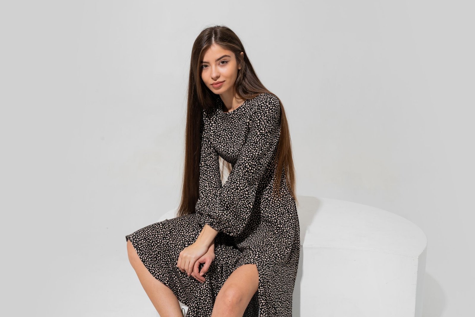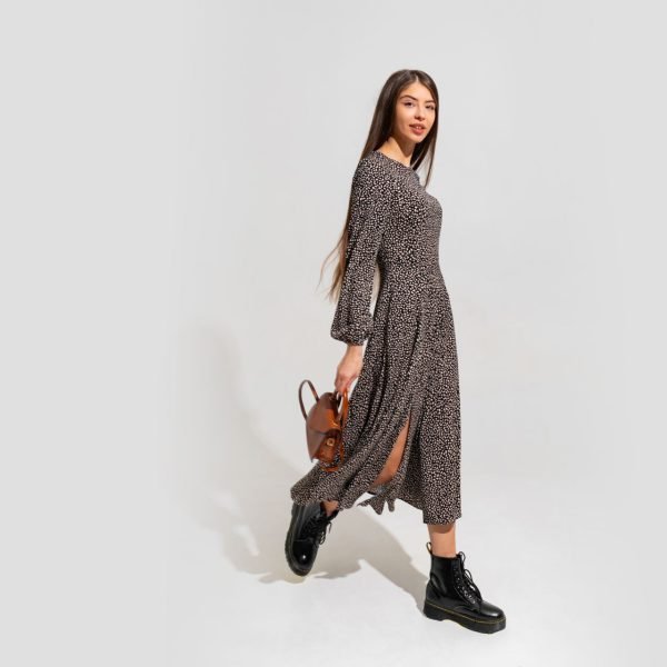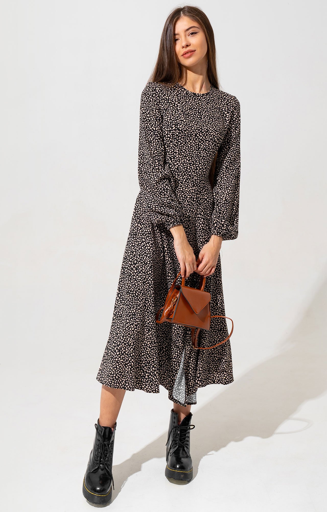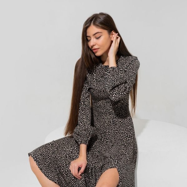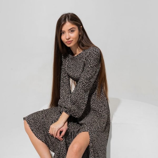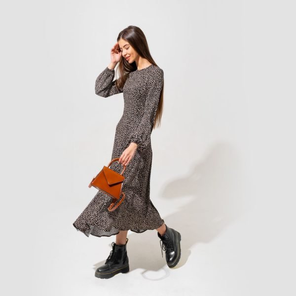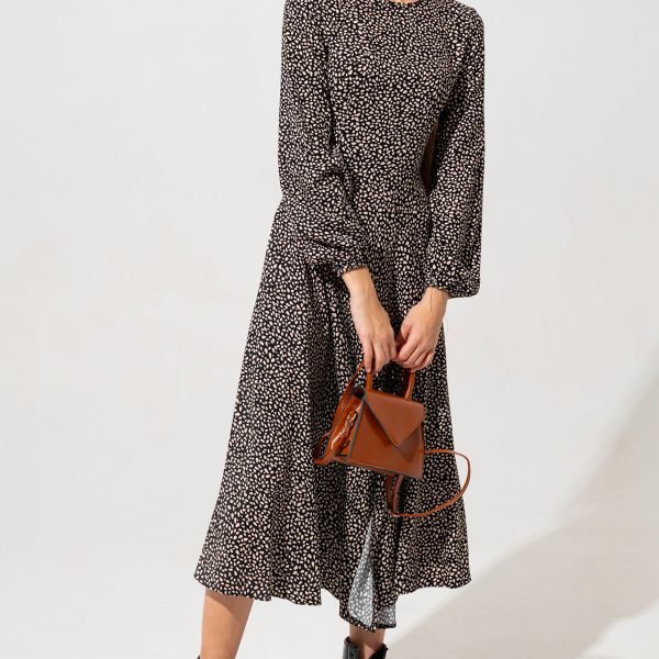 Embrace effortless elegance with this long-sleeve midi dress, featuring a delicate all-over print on a dark base. The round neckline and cinched waist create a flattering silhouette, while the softly flared skirt adds graceful movement. Made from a lightweight, breathable fabric, it’s comfortable enough for everyday wear yet chic enough for a night out. Pair it with ankle boots for a polished daytime look or dress it up with heels and a statement bag for an evening event.