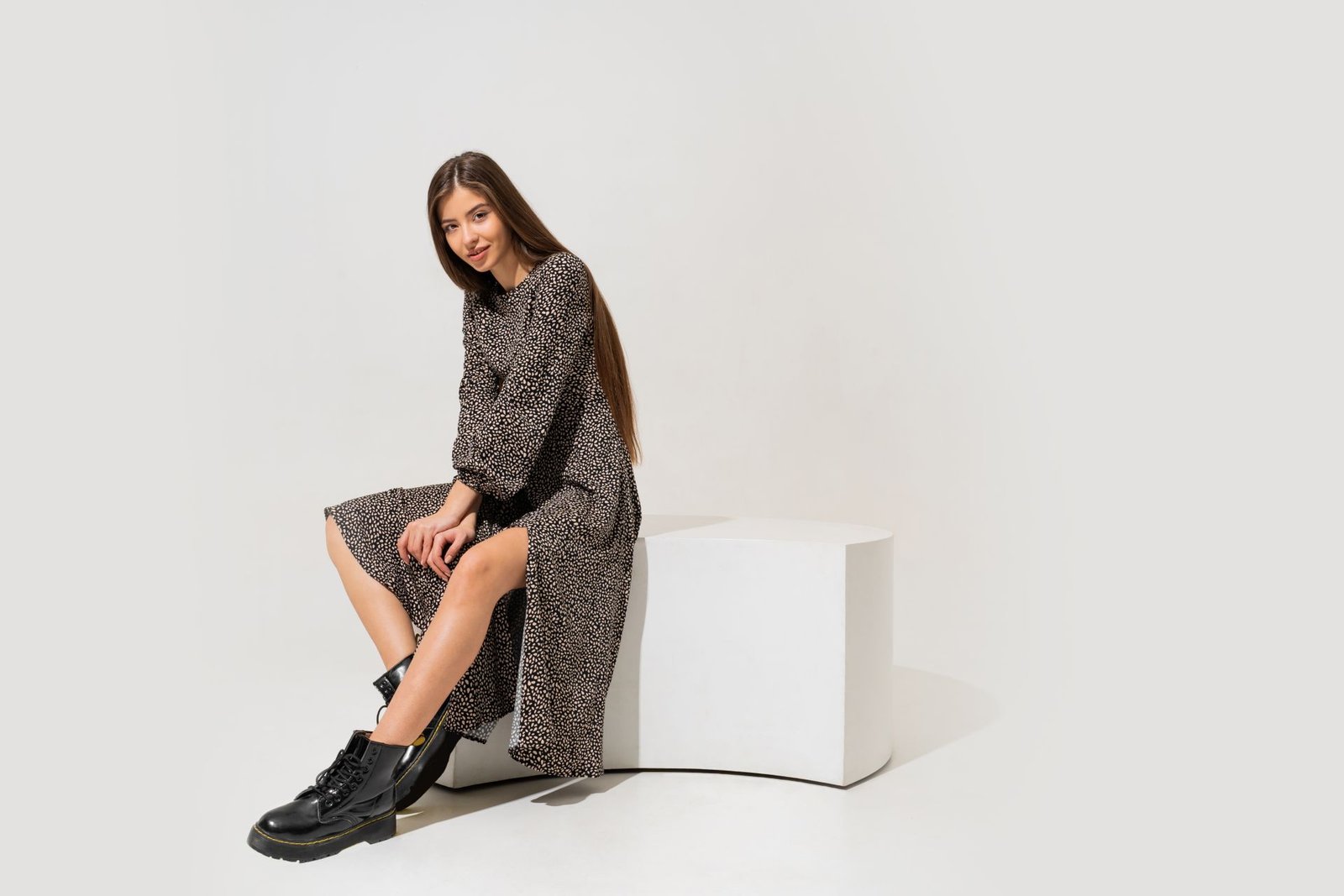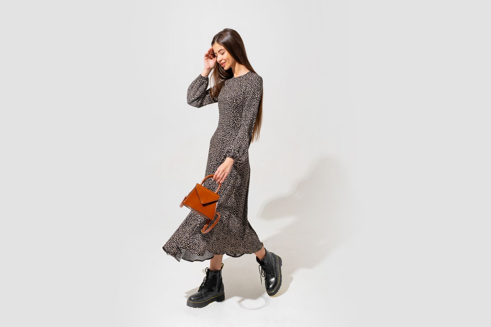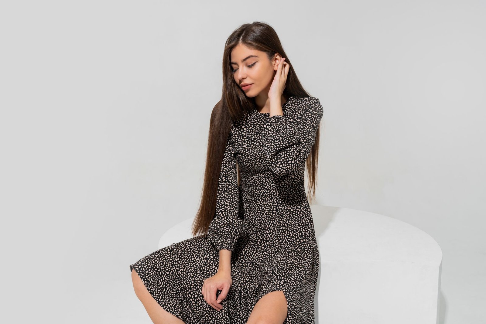Embrace effortless elegance with this long-sleeve midi dress, featuring a delicate all-over print on a dark base. The round neckline and cinched waist create a flattering silhouette, while the softly flared skirt adds graceful movement. Made from a lightweight, breathable fabric, it’s comfortable enough for everyday wear yet chic enough for a night out. Pair it with ankle boots for a polished daytime look or dress it up with heels and a statement bag for an evening event.