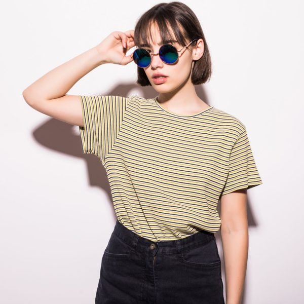 Inject a hint of retro flair into your everyday style with this striped T-shirt in a mustard-and-black color palette. Crafted from soft, breathable cotton, it features a classic crew neckline and a relaxed silhouette for easy comfort. The subtle stripes add visual interest without overwhelming your outfit, making it a versatile staple you can pair with high-waisted jeans, shorts, or skirts. Whether you’re running errands or meeting friends for coffee, this tee offers a laid-back vibe with a stylish edge.